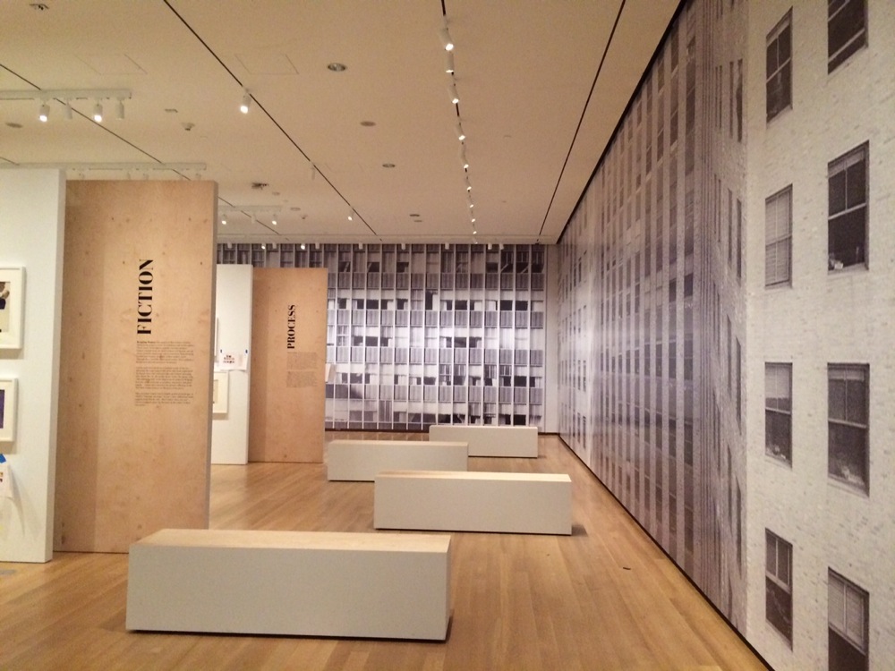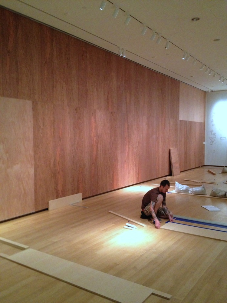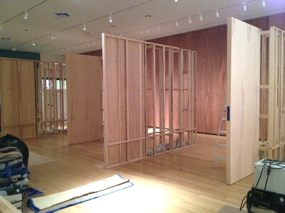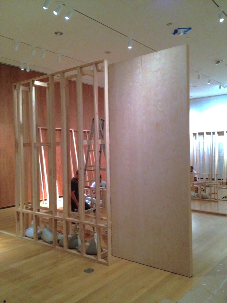 Five sets of parallel wall were built to display the work of Mac Conner. The designers included a 14 foot by 54 foot mirrored wall.