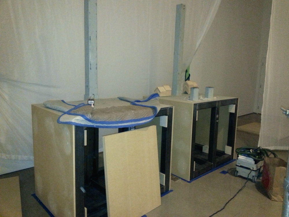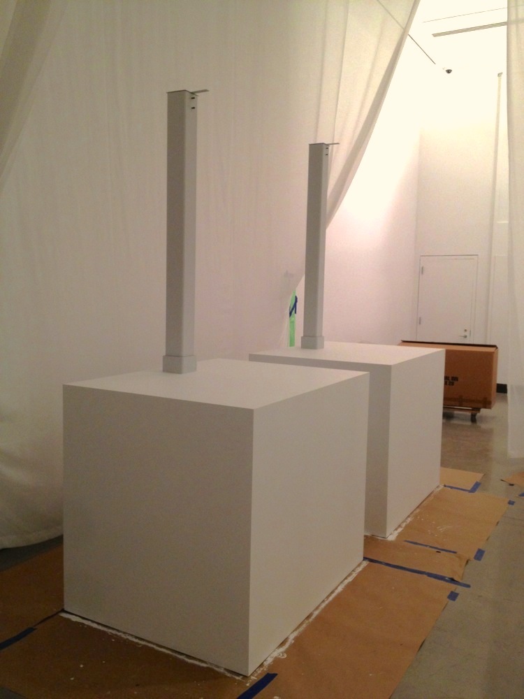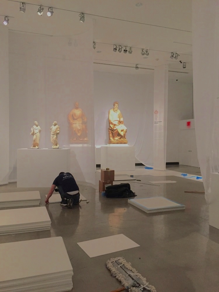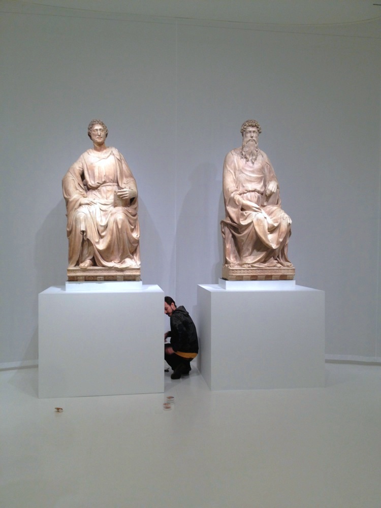 This Exhibition showcased Twenty-three masterpieces of early Florentine Renaissance sculpture from Il Duomo in Florence, by Donatello and his circle, including models of the cathedral dome by Brunelleschi, and works by Luca della Robia, Nanni di Banco and others. Most of the work was extremely heavy, and many of the plinths were made with welded square tube steel cages with 1/2″ plate steel top and bottoms skinned in MDF. Many plinths also had telescoping steel mounts that fit into iron hooks mounted in the stone.
